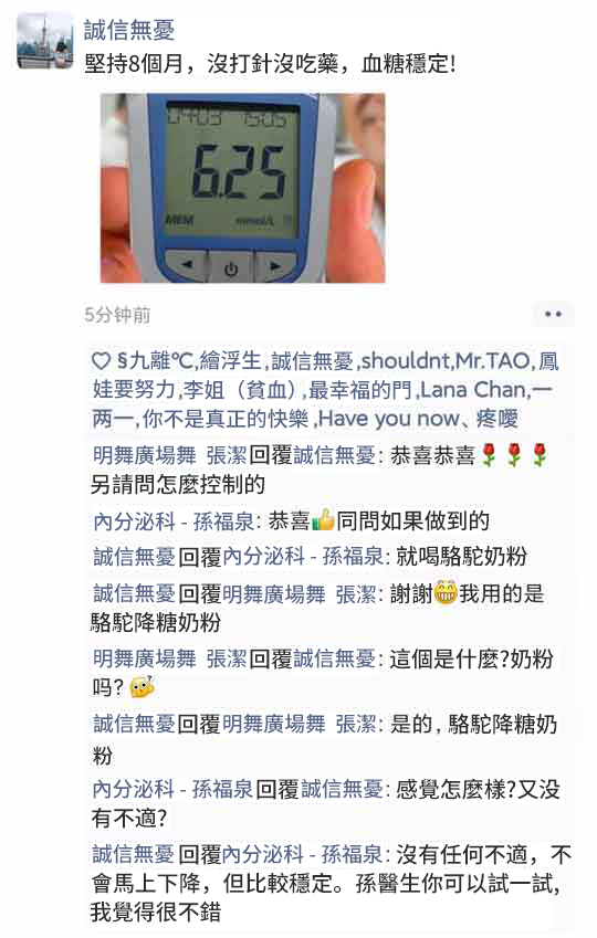 不是吧,樓主用的也是 他們家 的駝奶?沒想到這麼多醣友都在用啊,呵呵。之前我多年的高血糖也是多虧了駝奶 ,現在我血糖值穩定得很,簡直給了我第二次生命! 我加的是這個微訊號: ,真心有效!